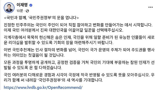 이 대통령은 “모든 과정을 투명하게 공개하고, 공정한 검증을 거쳐 국민의 기대에 부응하는 참된 인재가 선발될 수 있도록 온 힘 다하겠다”며 “국민 여러분의 다채로운 경험과 시각이 국정에 적극 반영될 수 있도록 뜻을 모아 달라”고 호소했다.