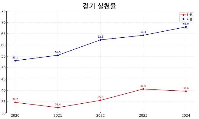 지역건강통계(2024)에 따르면, 강원의 걷기 실천율은 39.6%로 나타났는데, 이는 최근 일주일 동안 하루 30분 이상 걷는 활동을 주 5일 이상 실천한 사람들의 비율을 의미한다.