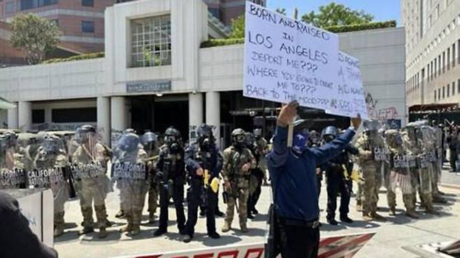 ▲ 현지 시간 8일 미국 LA에서 불법 이민 단속에 항의하는 시위대와 이를 막아선 주방위군