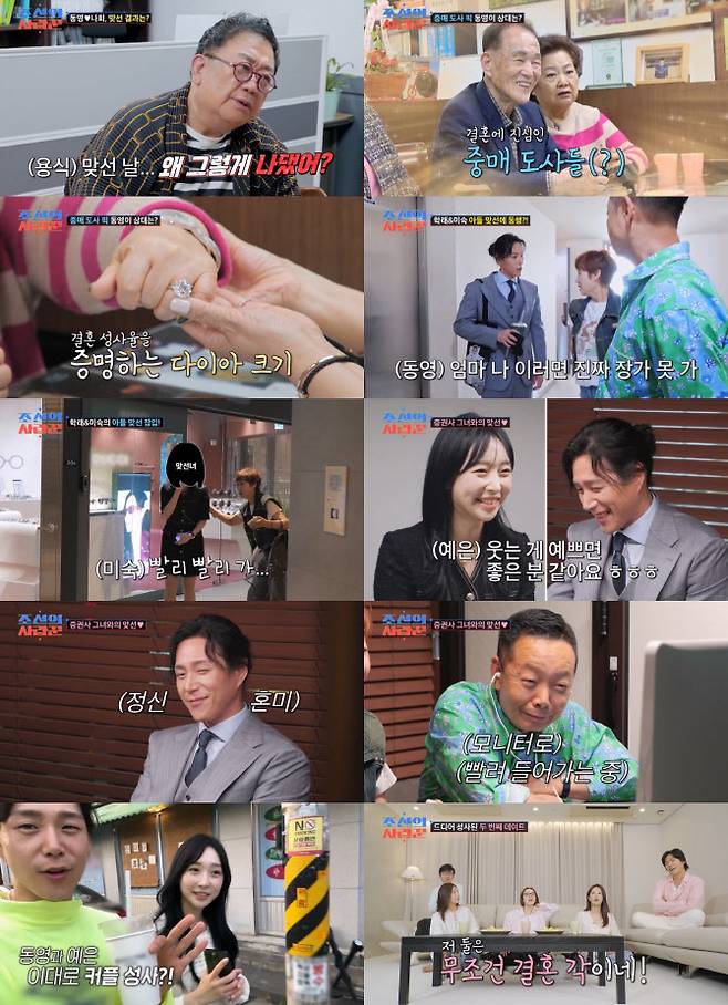 본격적인 결정사 서류를 작성하며 김동영은 이병헌·심현섭과 같은 중동고 출신에, 수십억에 달하는 수입을 갖췄다고 소개해 놀라움을 자아냈다. 결정사 대표는 “자네 나이에는 부모님 재산이 자네 결혼에 치명적으로 도움된다”며 김학래 부부의 ‘억’ 소리 나는 재산도 확인했다. 사전조사 뒤 결정사는 7세 연하의 ‘증권사 능력녀’를 김동영에게 매칭했다.