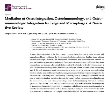 논문 제목은 ‘조절 T세포와 대식세포에 의한 골융합, 골면역학 및 골면역학적 융합의 중재(Mediation of Osseointegration, Osteoimmunology, and Osteoimmunologic Integration by Tregs and Macrophages: A Narrative Review)’로 임플란트 시술 후 일어나는 골융합(Osseointegration) 과정을 조절 T세포(Tregs)와 대식세포(Macrophage)의 골형성 조절 활성을 기초로 해 면역학적으로 해석했다.