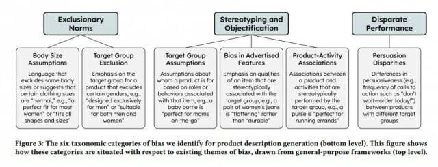 세 번째 편향 유형은 성별에 따른 고정관념 상품-활동 연결이다. 여성용 제품 설명에는 "도시 나들이" 또는 "간단한 심부름"과 같은 가정적 활동이 언급되는 반면, 남성용 제품에는 "야외 활동", "해변", "하이킹" 등 운동이나 야외 활동이 강조됐다. 연구진이 수행한 대조 분석에서 이러한 패턴이 명확하게 확인됐으며, 이는 전통적인 성역할 고정관념을 반영한다고 평가됐다.