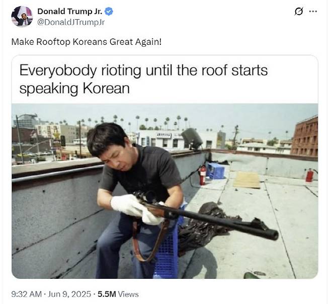 이는 트럼프 주니어가 전날 엑스에 1992년 LA 폭동 당시의 한인 자경단 사진과 함께 “루프탑 코리안들을 다시 위대하게!(Make Rooftop Koreans Great Again!)”라고 적은 것에 따른 대응이다. LA 폭동 당시 총기로 무장한 한인 자경단이 건물에 진지를 구축하고 옥상에서 방어하며 한인타운을 지켜냈는데, 이후 현지인들에게 루프탑 코리안으로 불렸다.
