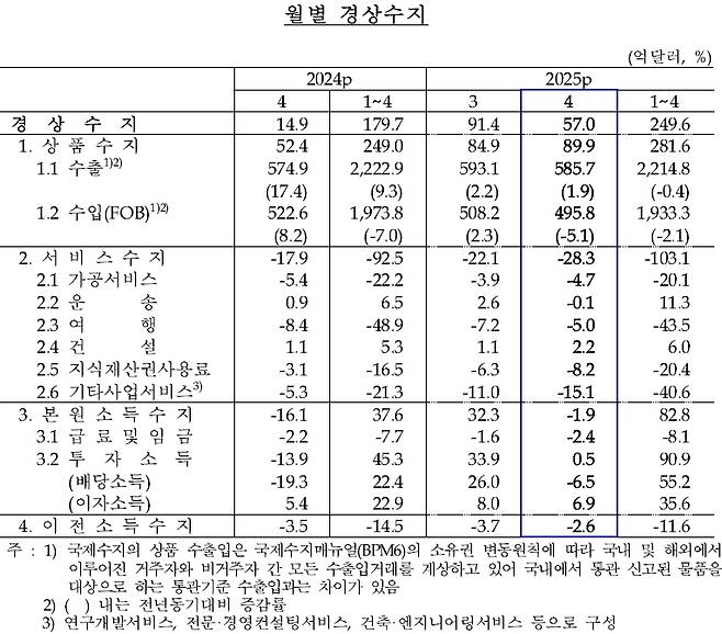 4월 경상수지 57억 달러 흑자..."관세 영향 점차 나타날 것"