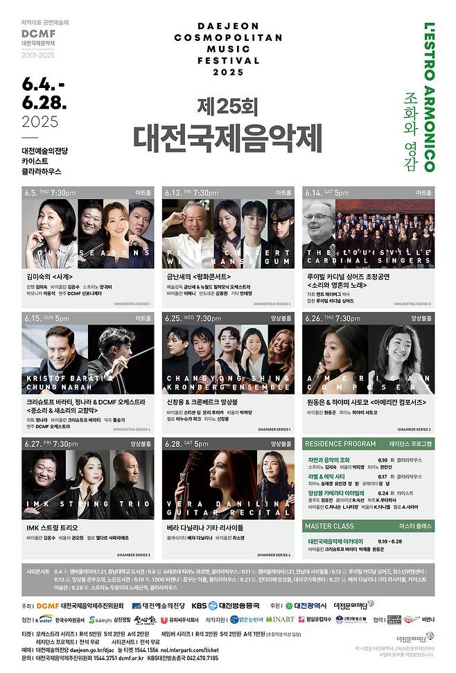 대전문화재단은 지역의 공연예술 문화를 선도하며 올해로 25번째 역사를 이어온 대전의 대표적인 음악축제로 2025 지역대표공연예술제지원사업에 선정된 '제25회 대전국제음악제–조화와 영감, L′estro armonico'이 지난 5일 개막 이후 클래식 애호가들의 호평속에 성황리에 진행 중이라고 밝혔다.