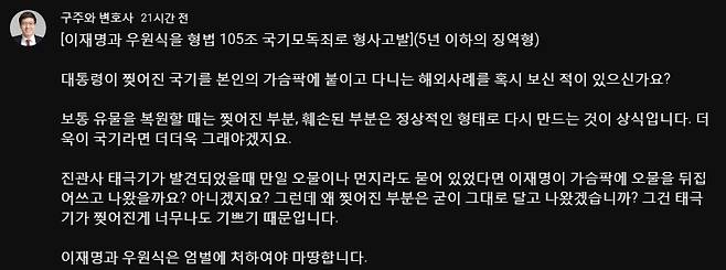 | ▲ 구주와 변호사는 자신의 유튜브 계정 커뮤니티에서 이재명 대통령과 우원식 국회의장이 불 타 손상된 진관사 태극기 배지를 단 것에 대해 '국기모독죄'로 고발하겠다고 나섰다. |