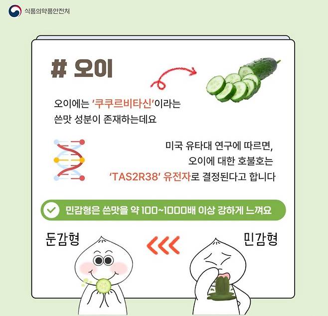 오이에는 ’쿠쿠르비타신‘이라는 쓴맛 성분이 있다. 식약처는 미국 유타대 연구를 인용해 오이에 대한 호불호는 TAS2R38 유전자’로 결정된다고 설명했다.