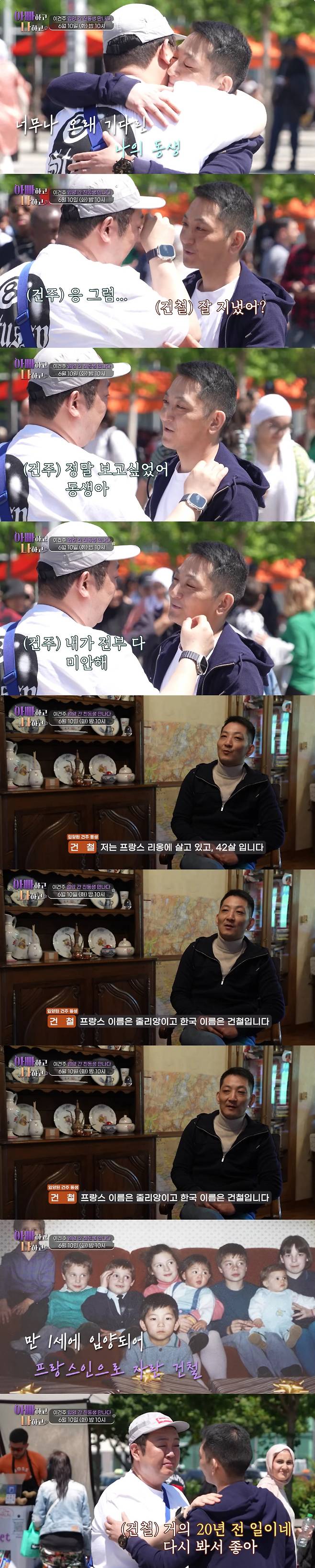 TV CHOSUN '아빠하고 나하고' 측은 10일 '※최초 공개※ '순돌이' 이건주, 프랑스로 입양 간 친동생과 눈물의 재회!'라는 제목의 예고 영상을 공개했다. 영상에는 이건주가 두 살 차이 나는 남동생과 프랑스에서 재회하는 모습이 담겼다.