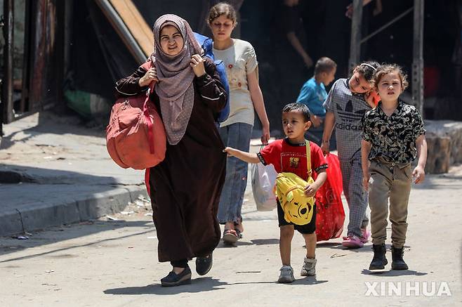[가자시티=신화/뉴시스] 가자지구 북부 자발리아에서 대피한 팔레스타인 피란민들이 9일(현지 시간) 가자시티에 도착하고 있다. 이스라엘군(IDF)은 지난 7일 공습을 앞두고 자발리아 난민 캠프 내 팔레스타인 주민들에게 대피령을 내렸다. 2025.06.10.