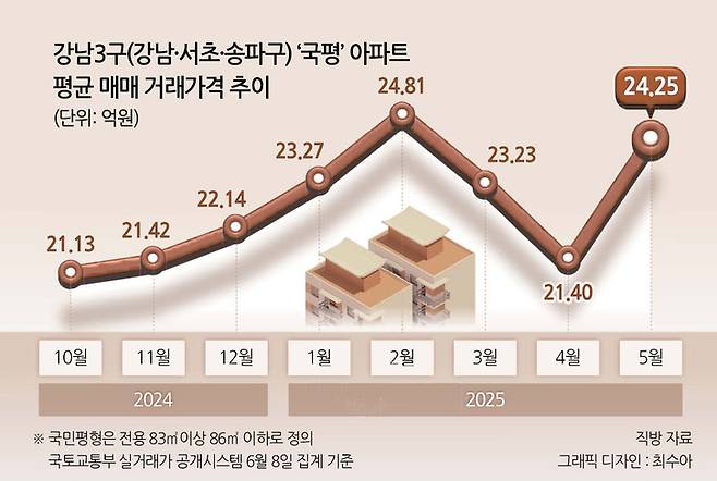 지난달 서울 강남3구(강남·서초·송파구) 에서 매매된 ‘국민평형(국평)’의 평균 거래가가 다시 24억원을 넘긴 것으로 집계됐다.