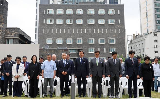 | ▲ 우원식 국회의장, 이재오 민주화운동기념사업회 이사장, 박찬대 더불어민주당 원내대표, 김용태 국민의힘 비상대책위원장, 김선민 조국혁싱당 대표 권한대행, 우상호 대통령실 정무수석이 10일 오전 서울 용산구 민주화운동기념관(옛 남영동 대공분실) 민주광장에서 열린 제38주년 6·10민주항쟁 기념식 및 민주화운동기념관 개관식에 참석해 순국선열과 호국영령, 민주화운동 희생자를 기리며 묵념하고 있다. |