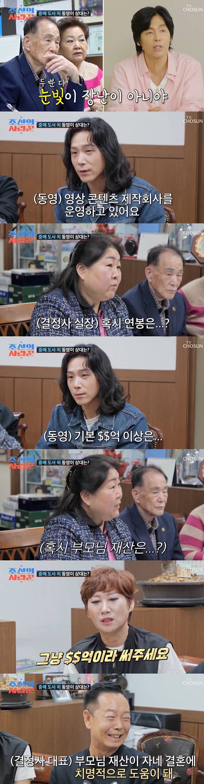 이를 들은 결정사 대표는 "부모님 재산이 자네 결혼에 치명적으로 도움이 된다"고 덧붙였고, 강수지와 황보라, 최성국은 "치명적이면 엄청나다는 거다", 저 결혼시장은 그런 게 있다. 주변 환경이 어떤지"라며 연신 감탄했다.