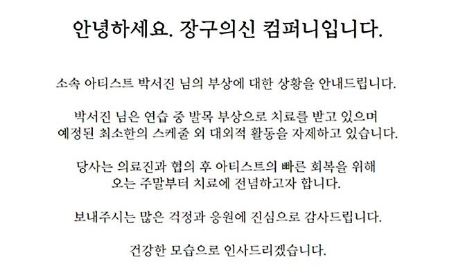 지난 9일 소속사 장구의신 컴퍼니는 박서진 공식 채널에 "소속 아티스트 박서진은 연습 중 발목 부상으로 치료를 받고 있으며 예정된 최소한의 스케줄 외 대외적 활동을 자제하고 있다. 당사는 의료진과 협의 후 아티스트의 빠른 회복을 위해 오는 주말부터 치료에 전념하고자 한다. 팬들의 걱정과 응원에 감사드리며 건강한 모습으로 인사드리겠다"고 밝혔다.
