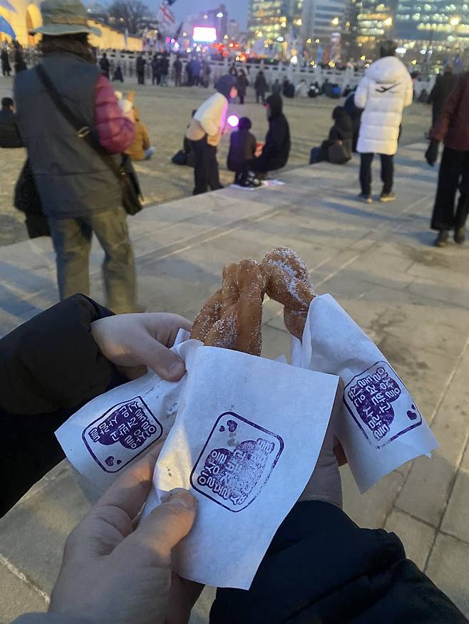 그때는 국회에서 탄핵이 통과됐는데도 탄핵 반대 측 세력이 커지고 있어서 기세를 끌어올릴 필요가 있었다. 꽈배기나 어묵, 감자는 꽤 효과가 있었다. SNS에는 '탄핵 꽈배기 먹고 에너지 충전' '꽈배기로 느끼는 탄핵의 맛, 아주 달달합니다' '춥고 배고팠는데 어묵 감사합니다' 등의 글이 알티(RT)를 탔고, 시위가 밥 먹여준다는 밈까지 생겼다.