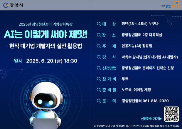 강의 내용은 인공지능에 대한 사전 지식이 없는 청년도 참여할 수 있도록 기초부터 실전까지 폭넓게 구성됐으며, 18세부터 45세까지 청년이면 누구나 신청 가능하다. 참여를 희망하는 청년은 오는 15일까지 광양청년꿈터 홈페이지를 통해 신청하면 된다.