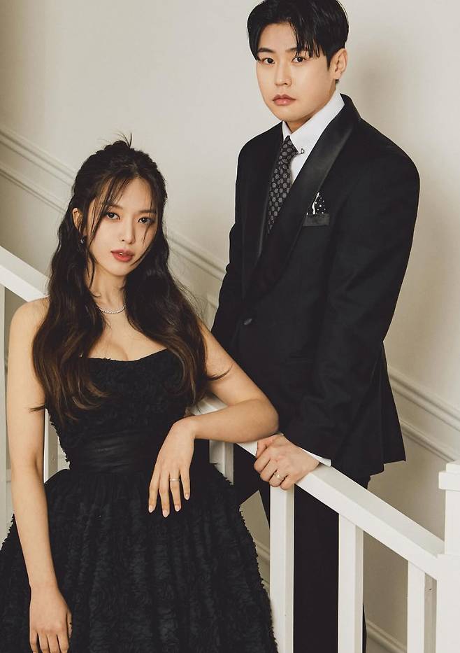 또 다른 화보에서는 블랙 드레스를 통해 고혹적인 분위기를 자아냈다. 단정한 포멀 수트 차림의 예비 신랑과 함께 깊이 있는 무드를 완성했다.
