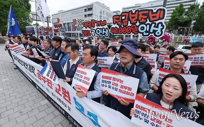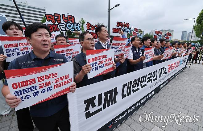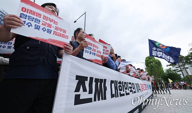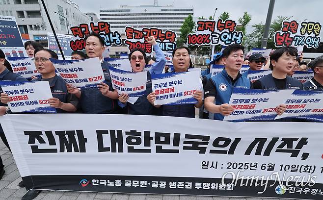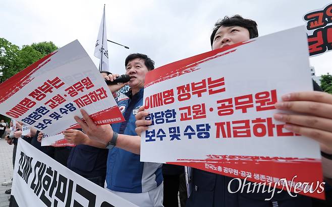 한국노총 공무원-공공 생존권투쟁위원회(한국노총 생투위) 소속 노동자들이 10일 오전 서울 용산구 대통령실 앞에서 '진짜 대한민국의 시작! 공무원-교원의 보수 현실화 요구 기자회견'을 열고 "공무원-교원 보수를 민간 수준에 맞춰 즉시 인상할 것과 공무원보수위원회의 권한 및 위상을 강화해 합리적 예측 가능한 보수 결정 구조 마련"을 촉구하고 있다.