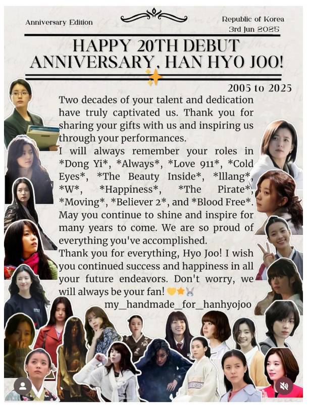 함께 공개된 사진들은 한효주의 20주년을 기념해 팬들이 직접 제작한 다양한 축하 메시지와 콜라주, 그리고 한효주의 지난 활동을 담은 이미지들로 구성됐다.
