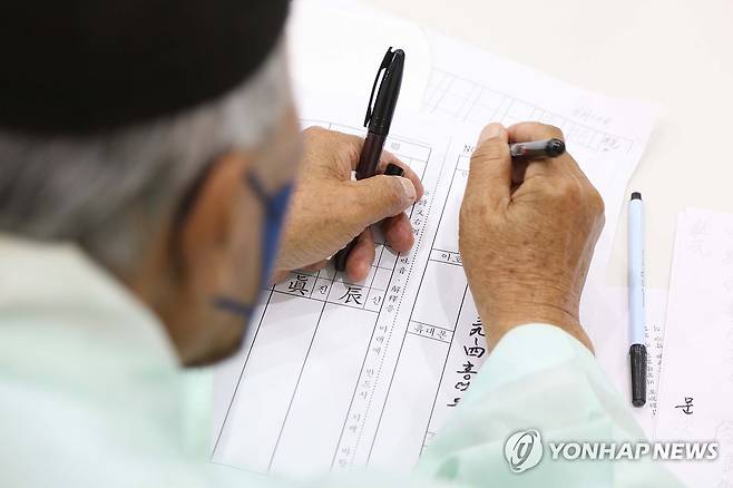 (구미=연합뉴스) 김현태 기자 = 10일 경북 구미시 새마을운동 테마공원에서 열린 28회 전국 한시 백일장에서 참석자들이 정성을 다해 글을 쓰고 있다. 2025.6.10