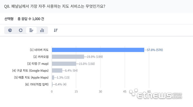 한편 국민들이 가장 자주 사용하는 지도 서비스는 '네이버 지도'가 57.0%로 1위를 차지했고, '카카오맵'(19.9%), '티맵'(15.0%), '구글 지도'(6.4%), '애플 지도'(1.3%) 순이었다. 네이버 지도를 주로 쓰는 이유로는 '익숙해서'(62.9%)가 가장 많았다.