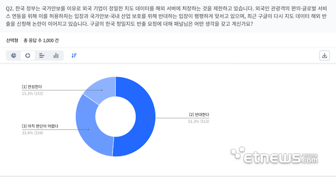 10일 전자신문이 소비자 데이터 플랫폼 오픈서베이에 의뢰해 전국 성인 남녀 1000명을 대상으로 진행한 조사에 따르면, 응답자의 51.3%가 구글의 정밀지도 반출 요청에 반대한다고 답했다. 찬성 응답은 15.3%에 그쳤으며, 33.4%는 판단이 어렵다고 응답했다.