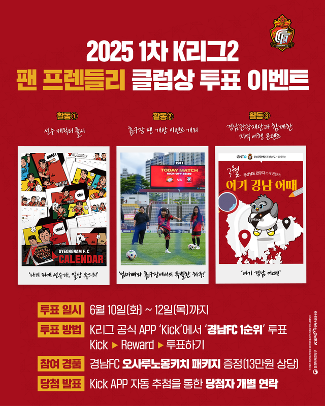 팬 투표는 6월 10일(화) 오전 8시부터 6월 12일(목) 자정까지 K리그 공식 어플리케이션 'Kick'을 통해 진행되며 경남은 투표를 해준 팬들을 추첨해 경남FC의 산리오 캐릭터인 '오사루노몽키치' 굿즈 패키지를 증정할 예정이다.