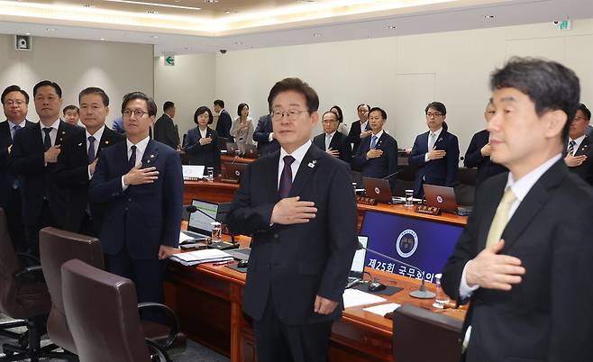 | ▲ 이재명 대통령이 10일 서울 용산 대통령실에서 열린 국무회의에서 국기에 경례하고 있다. |