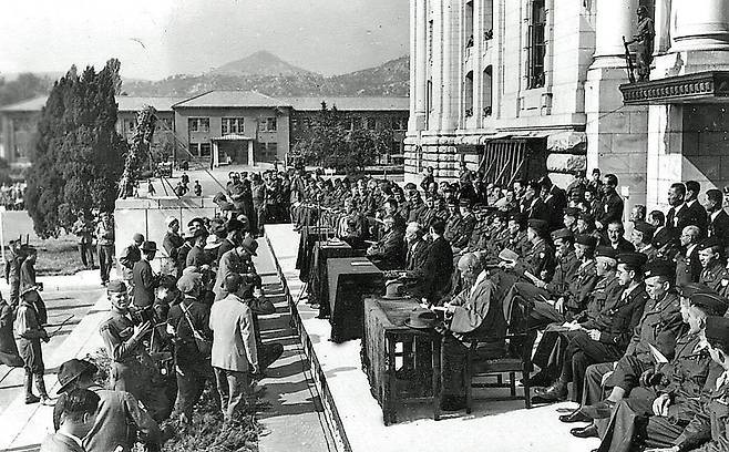 | ▲ 1945년 10월 20일 서울 중앙청 앞에서 열린 서울시민 주최 연합국환영대회에 이승만 박사가 앉아있다. |