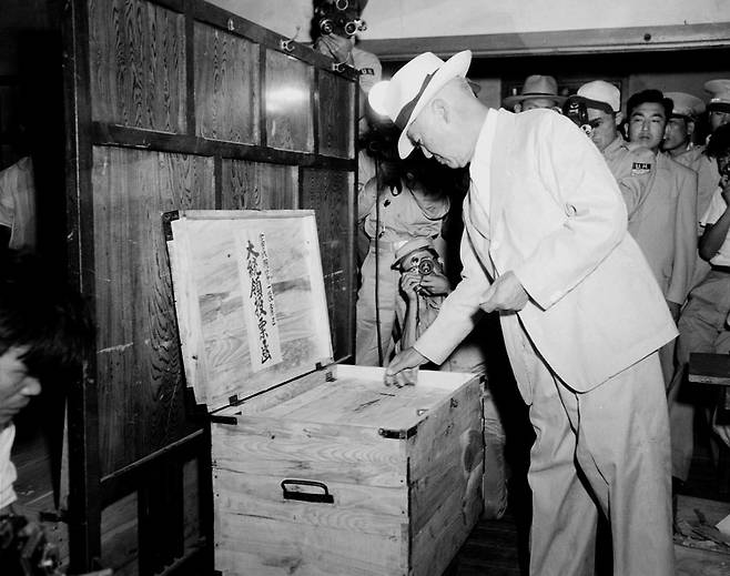| ▲ 이승만 대통령이 대통령 선거에 투표하고 있다. |