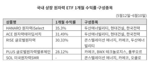 이를 포함해 국내 상장 ETF 중 최근 한 달 수익률 상위 10위권에는 원자력 관련 ETF가 다수 포진됐다. ACE 원자력테마딥서치(5위·31.49%), RISE 글로벌원자력(6위·30.33%), PLUS 글로벌원자력밸류체인(8위·28.12%) 등이다.