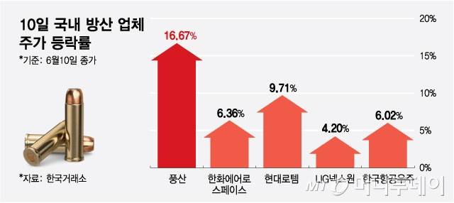 실제로 지난해 연말 대비 전날까지 (1월2일 시가~6월9일 종가) 한화에어로와 현대로템의 주가 각각 173%, 209% 급등했다. 반면 풍산은 32% 밖에 상승하지 못했다.