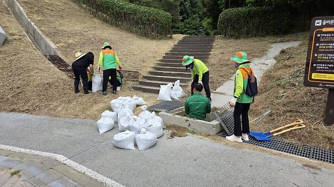 세종시가 9일 여름철 집중호우로 인한 침수 피해를 선제적으로 예방하기 위해 도담동 자율방재단과 함께 우람뜰근린공원 일대에서 배수로 정비 작업을 실시했다.