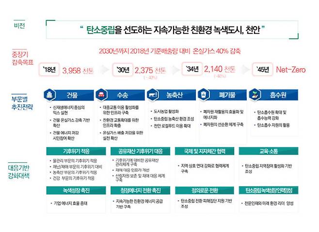 10일 시에 따르면 2030년까지 2018년 기준 온실가스 배출량 3958t 대비 40% 하락한 2375t까지 감축하고 2045년 탄소중립인 '0%'를 달성하고자 다양한 지역 특성을 종합 고려한 '탄소중립을 선도하는 지속가능한 친환경 녹색 도시, 천안'을 계획수립했다.