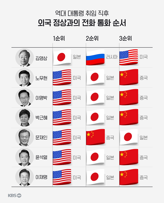 어느 나라 정상과 먼저 통화하느냐는 중요한 메시지를 담고 있습니다. 문민정부 출범 이후 지금까지 대부분 대통령은 미국, 일본, 중국 순서로 정상 간 통화를 했지만 문재인 정부는 미국 다음으로 중국 정상과 통화했습니다.