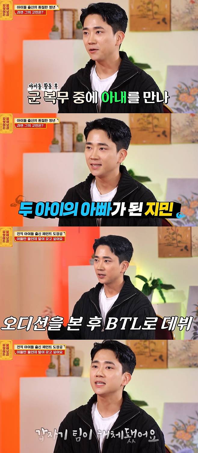 아이돌 데뷔 과정에 대해 그는 "대학교 다닐 때 화장실에서 연습생 형한테 명함을 받아서 오디션을 봤다"고 회상했다. 이후 2집 쇼케이스 영상까지 준비했지만 소속사의 사정으로 팀은 해체 수순을 밟았다.