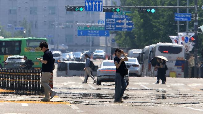▲ 내륙을 중심으로 낮 기온이 30도에 육박한 지난 9일 서울 여의도에서 시민들이 한낮의 태양 빛으로 달궈져 아지랑이가 피어오르는 도로를 횡단하고 있다.