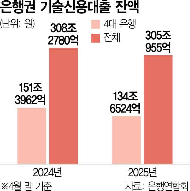10일 금융계에 따르면 올 4월 말 현재 4대 은행(KB국민·신한·하나·우리)의 기술신용대출 잔액은 134조 6524억 원으로 1년 새 16조 7438억 원이나 감소했다. 같은 기간 대출 건수는 33만 6086건에서 28만 758건으로 약 5만 5000건 줄었다.