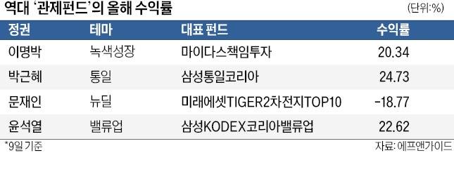10일 펀드평가사 에프앤가이드에 따르면 이명박 정부 때 조성한 녹색성장펀드인 ‘마이다스책임투자’는 올해 들어 전날까지 20.34%의 수익을 냈다. 2016년 박근혜 정부 당시 남북경협주에 투자하기 위해 만들어진 ‘삼성통일코리아’는 같은 기간 24% 넘는 수익률을 기록했다. 지난해 윤석열 정부 정책에 맞춰 나온 ‘밸류업’ 관련 상장지수펀드(ETF)도 선전하고 있다. 대표 밸류업 ETF로 불리는 ‘삼성KODEX코리아밸류업’의 연초 대비 수익률은 22.62%에 달한다.