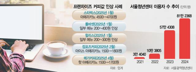 커피 가격을 비롯해 전방위적인 물가 상승 움직임에 커피숍 대신에 지방자치단체와 민간에서 운영하는 무료 청년 공간을 찾는 이용자 수가 크게 늘고 있다. 이 같이 무료 공간을 찾는 청년이 늘어나는 와중에 계란 가격까지 치솟으면서 베이커리 카페 사장 등 관련 자영업자들의 한숨도 커지고 있다.