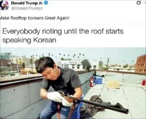 LA 한인회는 이날 "LA에서 아직 소요 사태가 진정되지 않는 가운데 도널드 트럼프 주니어가 33년 전 LA 폭동 당시 '루프톱 코리안'을 언급하며 이번 소요 사태를 조롱하는 게시물을 X에 게재하는 경솔함을 보였다"고 지적했다.