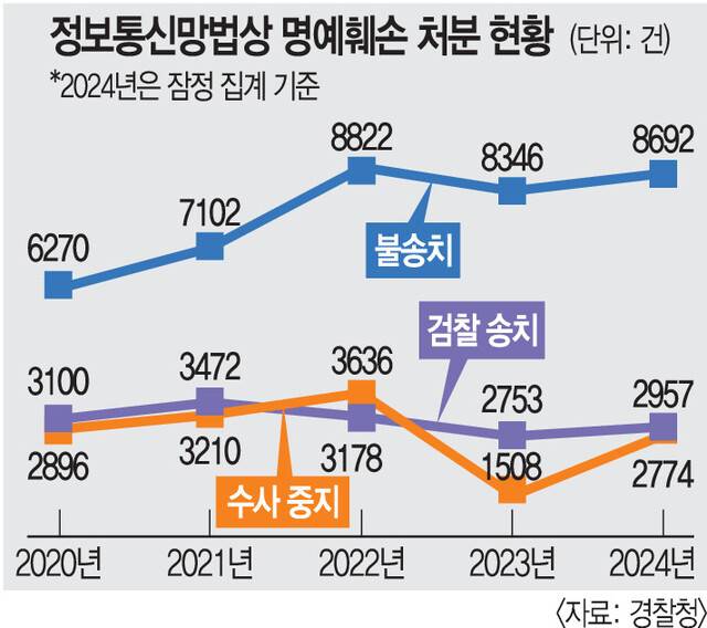 10일 국민일보가 경찰청으로부터 입수한 자료를 보면 지난해 기준 정보통신망법상 명예훼손 혐의로 접수된 고소장은 1만1949건(잠정)으로 집계됐다. 2020년 9140건에서 2021년 1만1354건으로 늘어난 이후 계속해서 연 1만건을 넘어서고 있다. 그런데 지난해 기준 2957건이 검찰로 송치된 반면 불송치 처분 건은 72.7%인 8692건에 달했다.