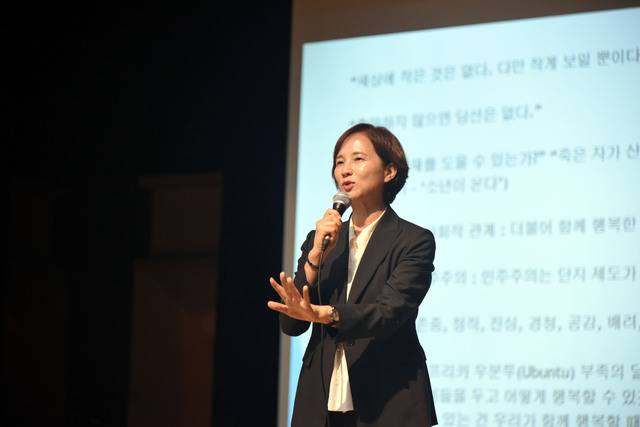 유 전 부총리는 '내 삶의 중요한 순간들'을 주제로 한 강연에서 "삶의 방향을 결정짓게 했던 1980년 6월 광주민주화항쟁과 제 삶의 스승인 김근태 의장과의 인연이 오늘의 저를 만들었다"며 개인의 역사와 민주주의 가치에 대해 들려줬다.