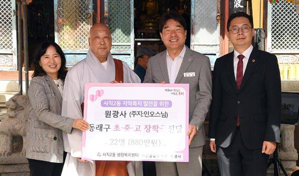 원광사는 지역 내 한부모가정 학생 2명을 포함해 동래구에 거주하는 초·중·고등학생 22명에게 장학금을 전달했으며, 저소득 12세대에게는 샴푸·치약 등 생필품 12세트도 지원했다.