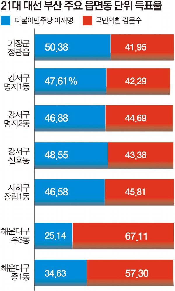 21대 대통령 선거 결과 더불어민주당 이재명 대통령이 부산 기장군 정관읍에서 부산 읍·면·동 단위에서는 유일하게 과반을 득표해 국민의힘 김문수 후보를 8%포인트 이상 여유 있게 따돌린 것으로 확인됐다. 강서구 명지국제신도시와 오션시티가 있는 명지1, 2동은 물론 신호주거단지가 있는 신호동도 이 대통령의 득표율이 김 후보보다 높게 나타났다. 부촌이자 부산 내에서도 국민의힘의 텃밭인 해운대구 마린시티와 엘시티지역에서는 김 후보의 득표율이 3년 전 윤석열 전 대통령보다 7%포인트 이상 낮았다.