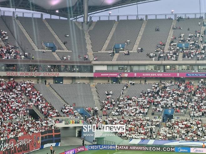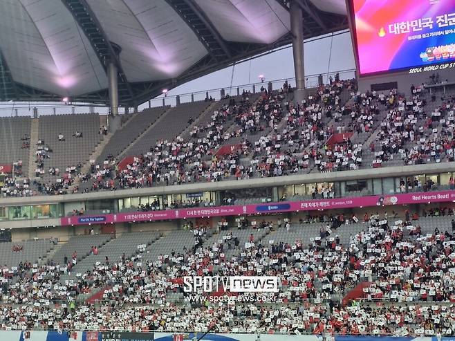 하지만 이날 육안으로도 텅 빈 경기장 곳곳을 확인할 수 있다. 한국 경기 예매를 관리하는 사이트 ‘플레이KFA’를 확인해보면 경기 시작 시간인 오후 8시 기준 약 2만 5,000표가 팔리지 않았다. 6만 5,000명을 수용할 수 있는 곳이기에 약 3분의 2 정도가 경기장을 찾았을 뿐이다.