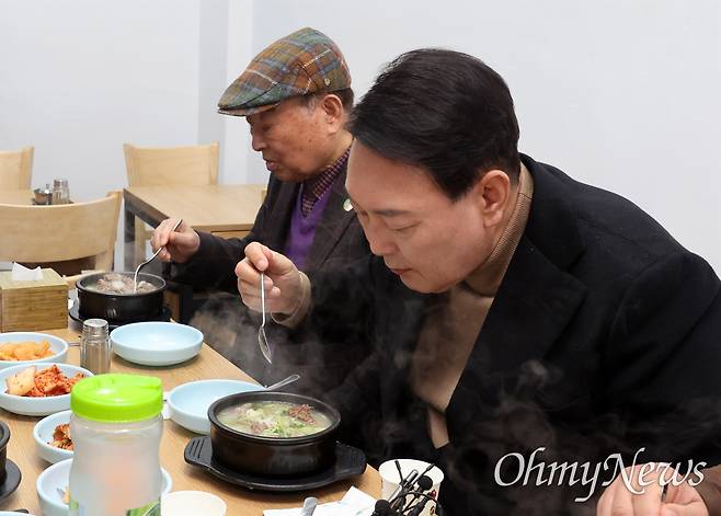 | ▲ 윤석열 대통령 당선인이 2022년 3월 14일 당선 이후 첫 외부 공식일정으로 서울 남대문시장을 찾아 상인회 회장단과 간담회를 마친 뒤 식당에서 함께 식사를 하고 있다. |