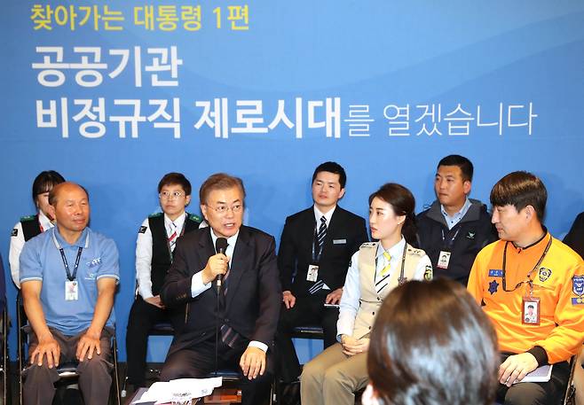 | ▲ "좋은 일자리 많이 만들겠습니다" 문재인 대통령이 2017년 5월 12일 인천공항공사에서 열린 `찾아가는 대통령. 공공부문 비정규직 제로시대를 열겠습니다!' 행사에서 좋은 일자리 만들기 등에 대해 언급하고 있다. |