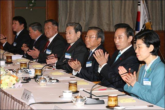 | ▲ 이명박 대통령 당선인과 이경숙 인수위원장이 2007년 12월 28일 오전 여의도 전경련회관에서 열린 경제인 간담회에서 조석래 전경련회장, 이건희 삼성그룹 회장, 정몽구 현대기아차그룹 회장, 구본무 LG그룹회장, 최태원 회장과 함께 박수를 치고 있다. |