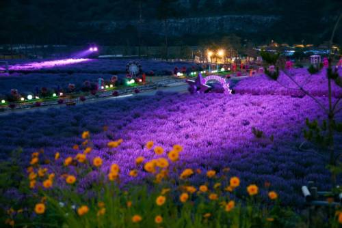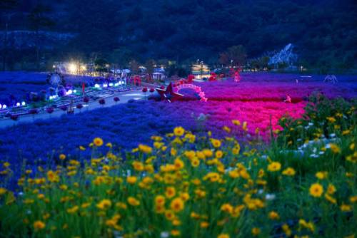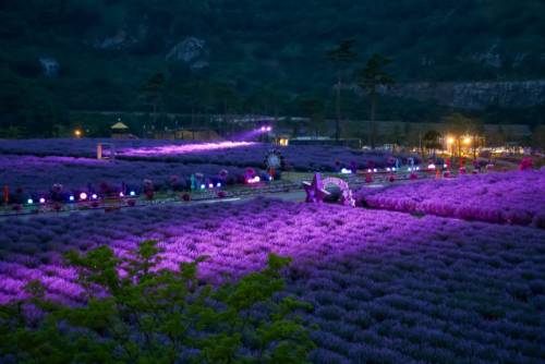별빛 아래에서 라벤더와 조명이 어우러진 보랏빛 정원은 한 편의 동화처럼 환상적인 분위기를 자아낸다.