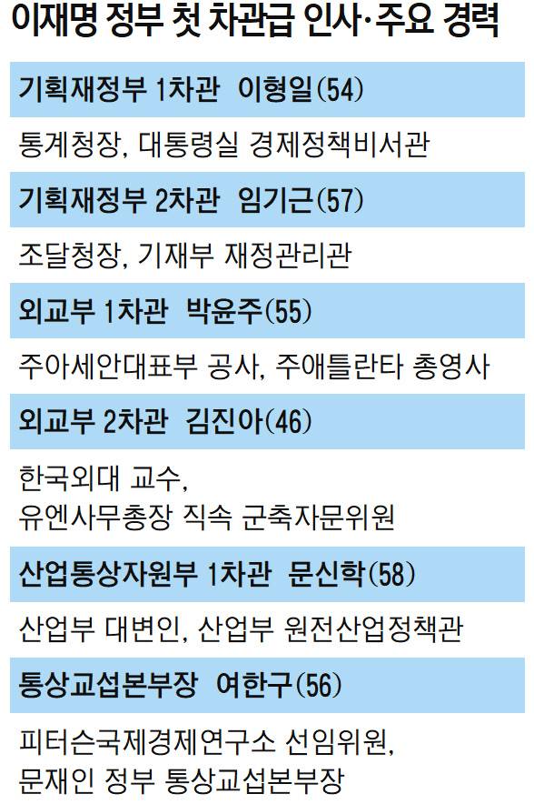 이 대통령은 이날 기재부 1차관에 이형일 통계청장을, 2차관에 임기근 조달청장을 각각 임명했다. 외교부 1차관엔 박윤주 주아세안대표부 공사, 2차관엔 김진아 한국외국어대 교수가 임명됐다. 산업부 1차관에는 문신학 전 산업부 대변인을, 통상교섭본부장에는 여한구 피터슨국제경제연구소 선임위원을 발탁했다.